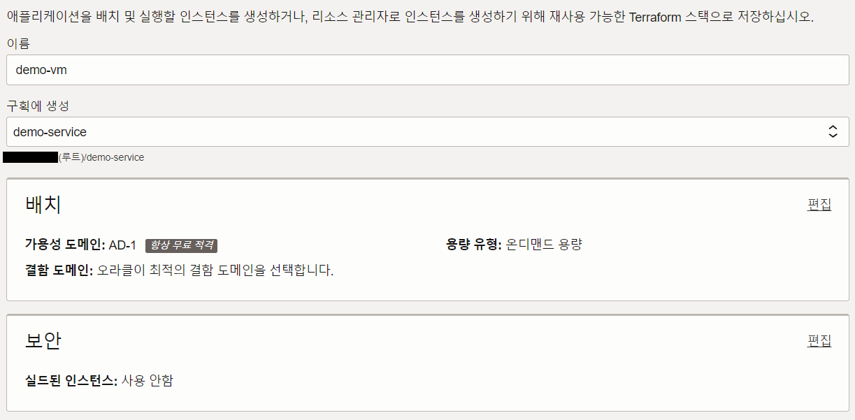 전 이전 글에서 생성한 "demo-service" 구획을 선택했습니다. 3. 컴퓨트 인스턴스 생성