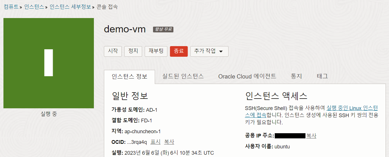 생성 버튼을 누르면 약 1분 후 VM이 생성되어 작동합니다.