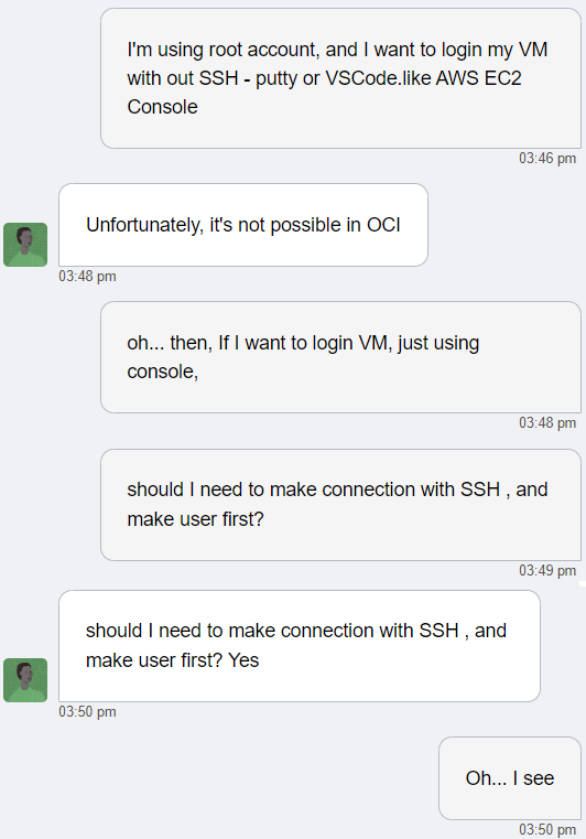 어설픈 영어로 문의한 결과... AWS EC2처럼 콘솔만으로 접속하는건 아직 안된다고 하네요...ㅠㅠ 아직까지 OCI에서는 SSH 키를 이용한 VM 접속만을 지원하고 있습니다.