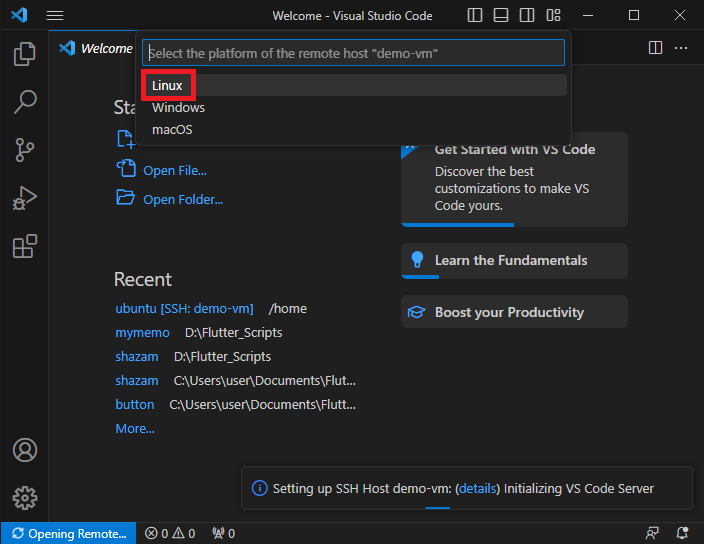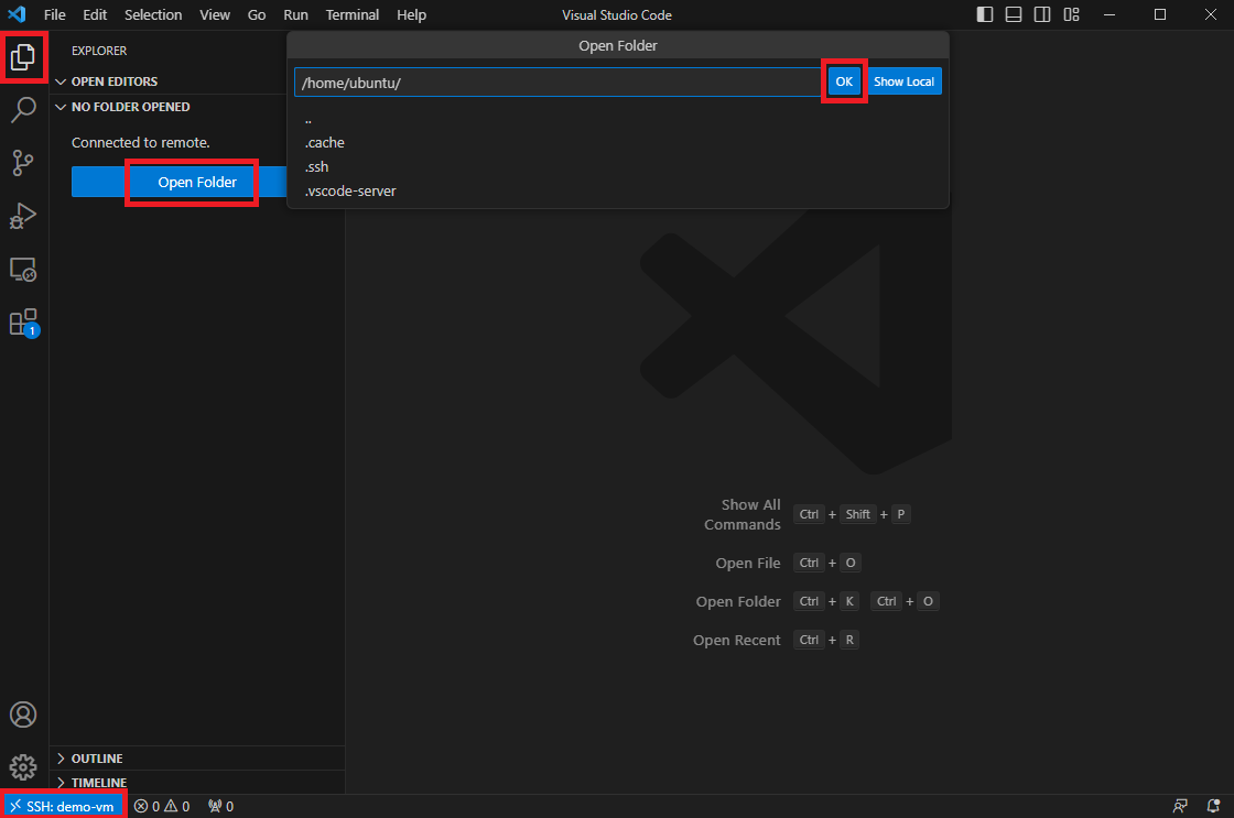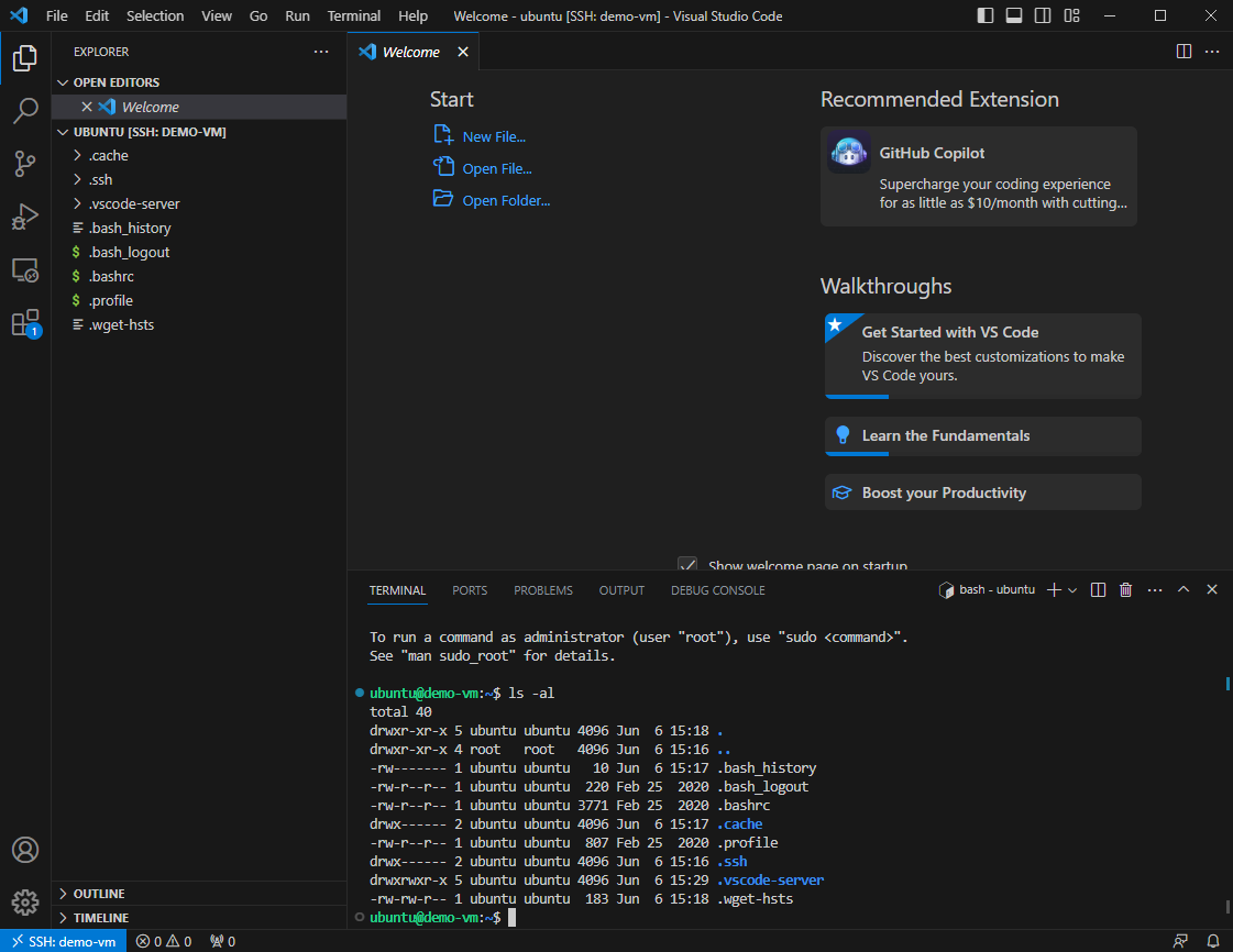 4) 왼쪽 하단을 보면 SSH: demo-vm 이라고 적혀있습니다! 원격접속에 성공했습니다!!!