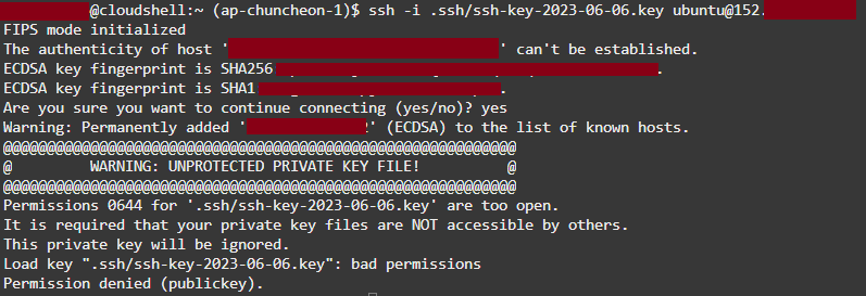 $ chmod 400 .ssh/ssh-key-2023-06-06.key $ ssh -i .ssh/ssh-key-2023-06-06.key ubuntu@152.xxx.xxx.xxx