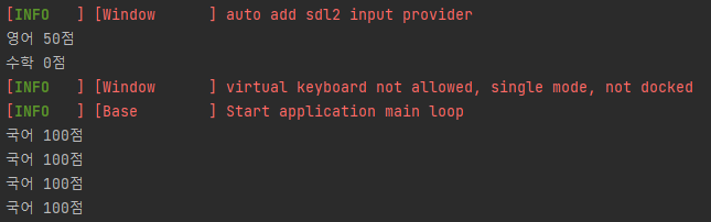 from kivy.app import App from kivy.clock import Clock from functools import partial class ClockDemo(App): def my_callback(subject, point, *args): print(subject, point) # call my_callback every 2 seconds Clock.schedule_interval(partial(my_callback, '국어', '100점'), 2) # call my_callback in 0.1 seconds Clock.schedule_once(partial(my_callback, '영어', '50점'), 0.1) # call my_callback as soon as possible (usually next frame.) Clock.schedule_once(partial(my_callback, '수학', '0점')) # Run the app if __name__ == '__main__': ClockDemo().run()