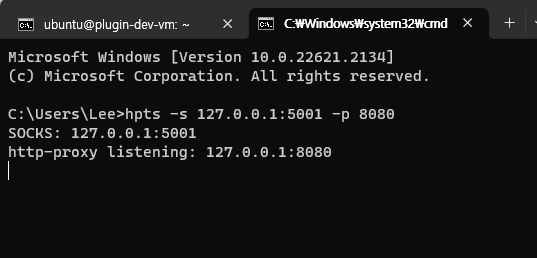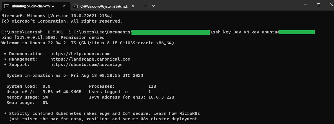 # password를 이용하는 경우 ssh -D {port} {username}@{public-VM-IP} # ssh키를 이용하는 경우 ssh -D {port} -i {path-of-key-file} {username}@{public-VM-IP} # 제가 접속에 사용한 명령 ssh -D 5001 -i C:\Users\Lee\Documents\ssh\ssh-key-VM.key ubuntu@xxx.xx.xx.xxx