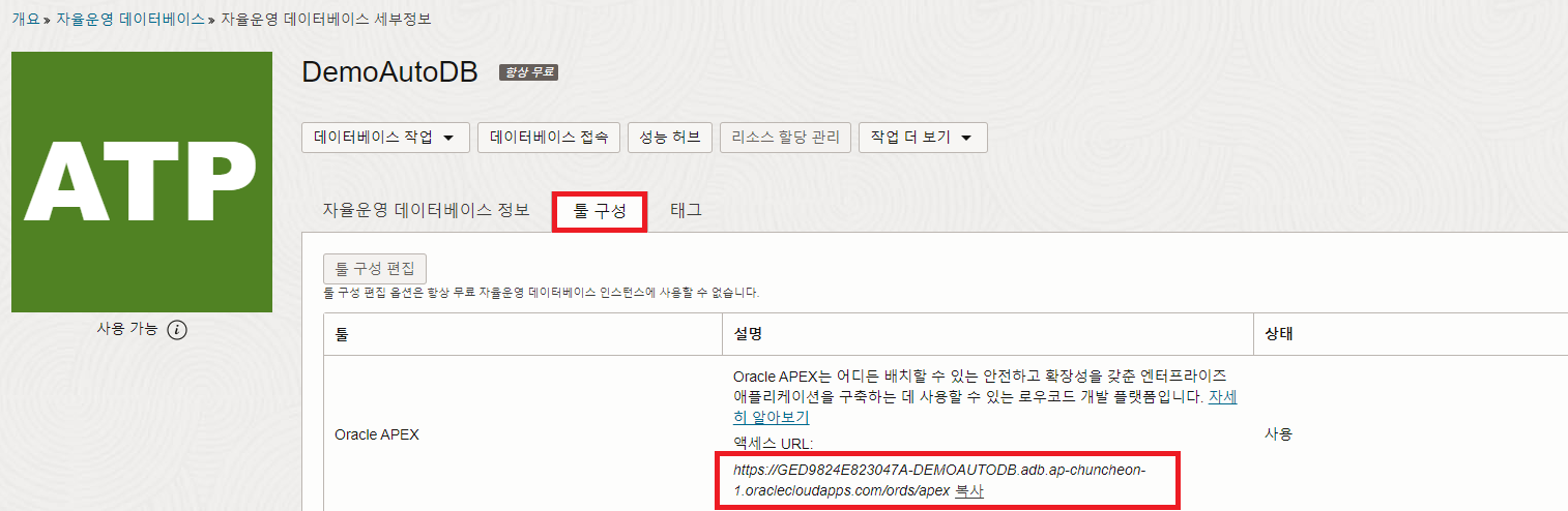 Autonomous DB 인스턴스의 프로비저닝이 완료되었다면 Tools 탭으로 들어갑니다.