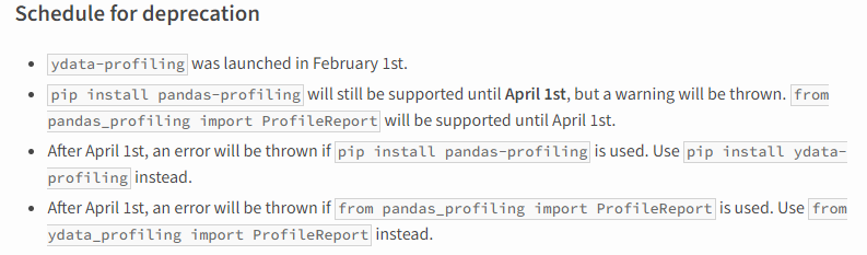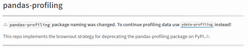 Deprecated 'pandas-profiling' package, use 'ydata-profiling' instead