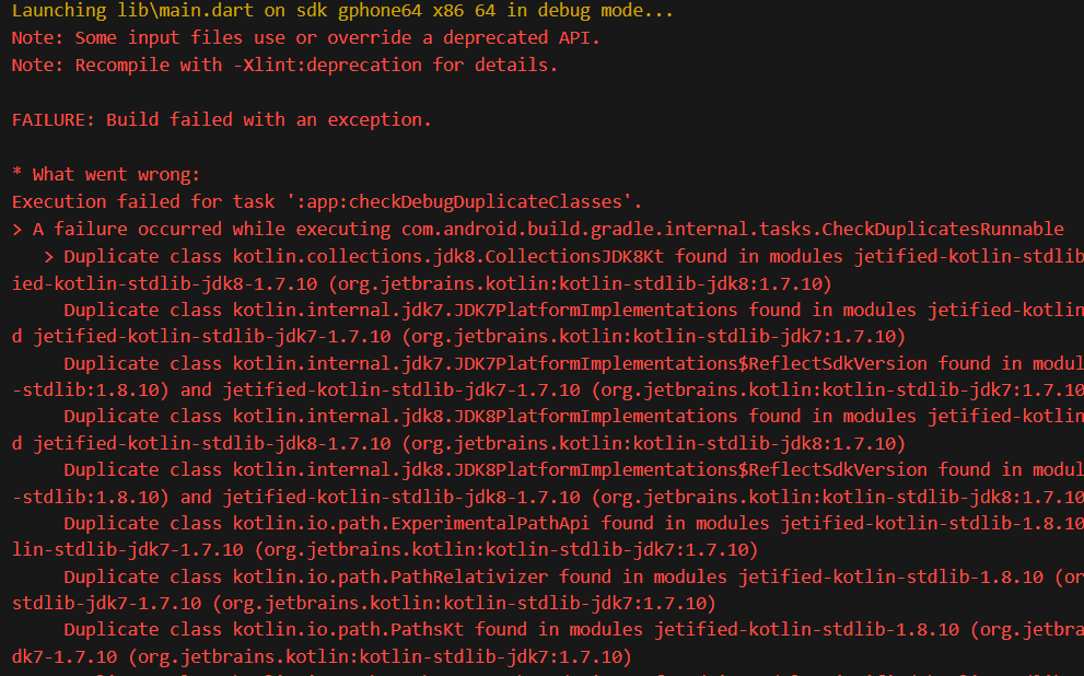 Launching lib\main.dart on sdk gphone64 x86 64 in debug mode... Note: Some input files use or override a deprecated API. Note: Recompile with -Xlint:deprecation for details. FAILURE: Build failed with an exception. * What went wrong: Execution failed for task ':app:checkDebugDuplicateClasses'. > A failure occurred while executing com.android.build.gradle.internal.tasks.CheckDuplicatesRunnable > Duplicate class kotlin.collections.jdk8.CollectionsJDK8Kt found in modules jetified-kotlin-stdlib-1.8.10 (org.jetbrains.kotlin:kotlin-stdlib:1.8.10) and jetified-kotlin-stdlib-jdk8-1.7.10 (org.jetbrains.kotlin:kotlin-stdlib-jdk8:1.7.10) Duplicate class kotlin.internal.jdk7.JDK7PlatformImplementations found in modules jetified-kotlin-stdlib-1.8.10 (org.jetbrains.kotlin:kotlin-stdlib:1.8.10) and jetified-kotlin-stdlib-jdk7-1.7.10 (org.jetbrains.kotlin:kotlin-stdlib-jdk7:1.7.10) ... (생략) * Try: > Run with --stacktrace option to get the stack trace. > Run with --info or --debug option to get more log output. > Run with --scan to get full insights. * Get more help at https://help.gradle.org BUILD FAILED in 8s Exception: Gradle task assembleDebug failed with exit code 1 Exited (1).