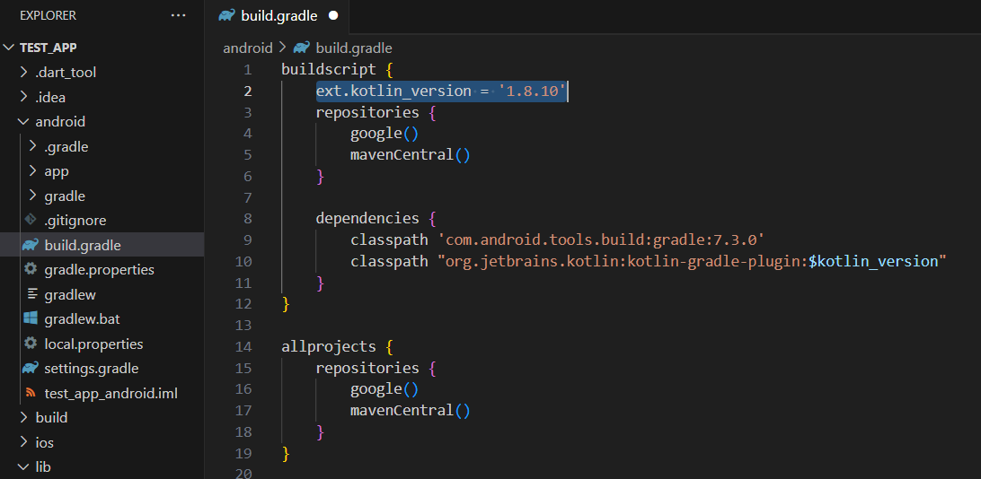 android/build.gradle 파일에서 ext.kotlin_version을 올바른 버전으로 변경한 뒤 저장합니다.