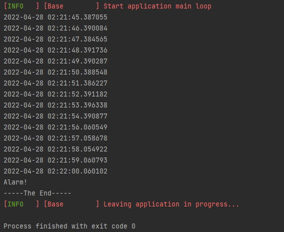 from kivy.app import App from kivy.clock import Clock from datetime import datetime class ClockDemo(App): # print alarm def alarm(self): print("Alarm!") # turn on alarm def on_start(self): self.beep_time = datetime.strptime("22-04-28 02:22:00", "%y-%m-%d %H:%M:%S") self.tick = Clock.schedule_interval(self.update, 1) # tick tok every 1 second def update(self, dt): self.now = datetime.now() print(self.now) # beep & alarm at beep_time if self.now >= self.beep_time: self.alarm() self.tick.cancel() print("-----The End-----") # Run the app if __name__ == '__main__': ClockDemo().run()