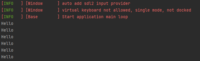 from kivy.app import App from kivy.clock import Clock class ClockDemo(App): # dt means delta-time def my_callback(dt): print('Hello') # call my_callback every 2 seconds Clock.schedule_interval(my_callback, 2) # call my_callback in 0.1 seconds Clock.schedule_once(my_callback, 0.1) # call my_callback as soon as possible (usually next frame.) Clock.schedule_once(my_callback) # Run the app if __name__ == '__main__': ClockDemo().run()공식문서에서의 코드와 다른 점이라면