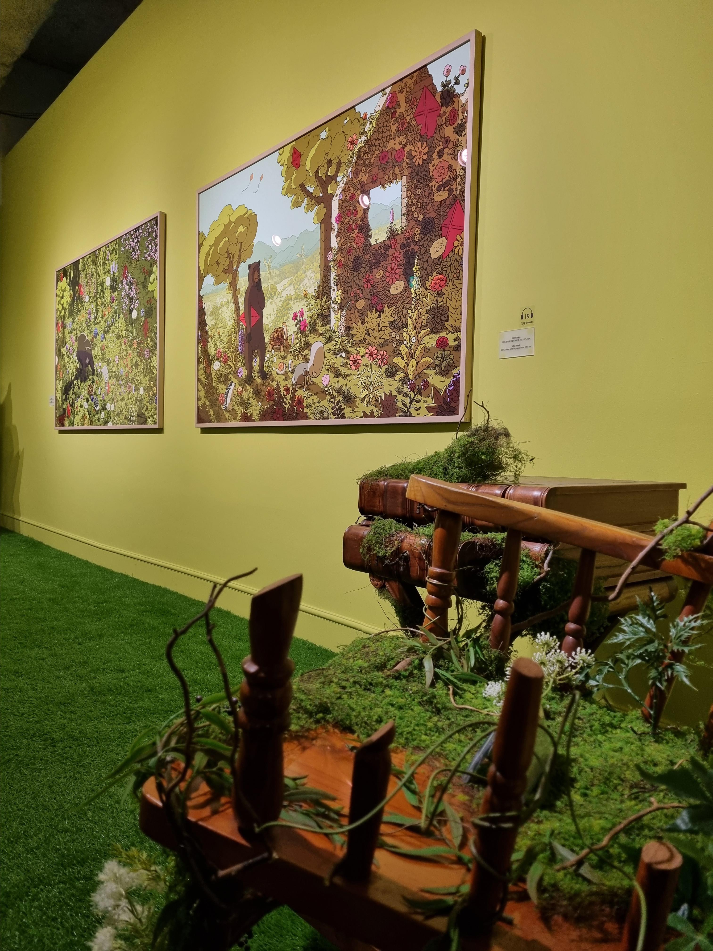 그런만큼 전시장 내 인테리어도 지금까지와는 사뭇 다르게, 바닥에 잔디가 깔리고 의자와 기타 사물 위에도 식물들이 자라난 모습을 보여주고 있습니다.