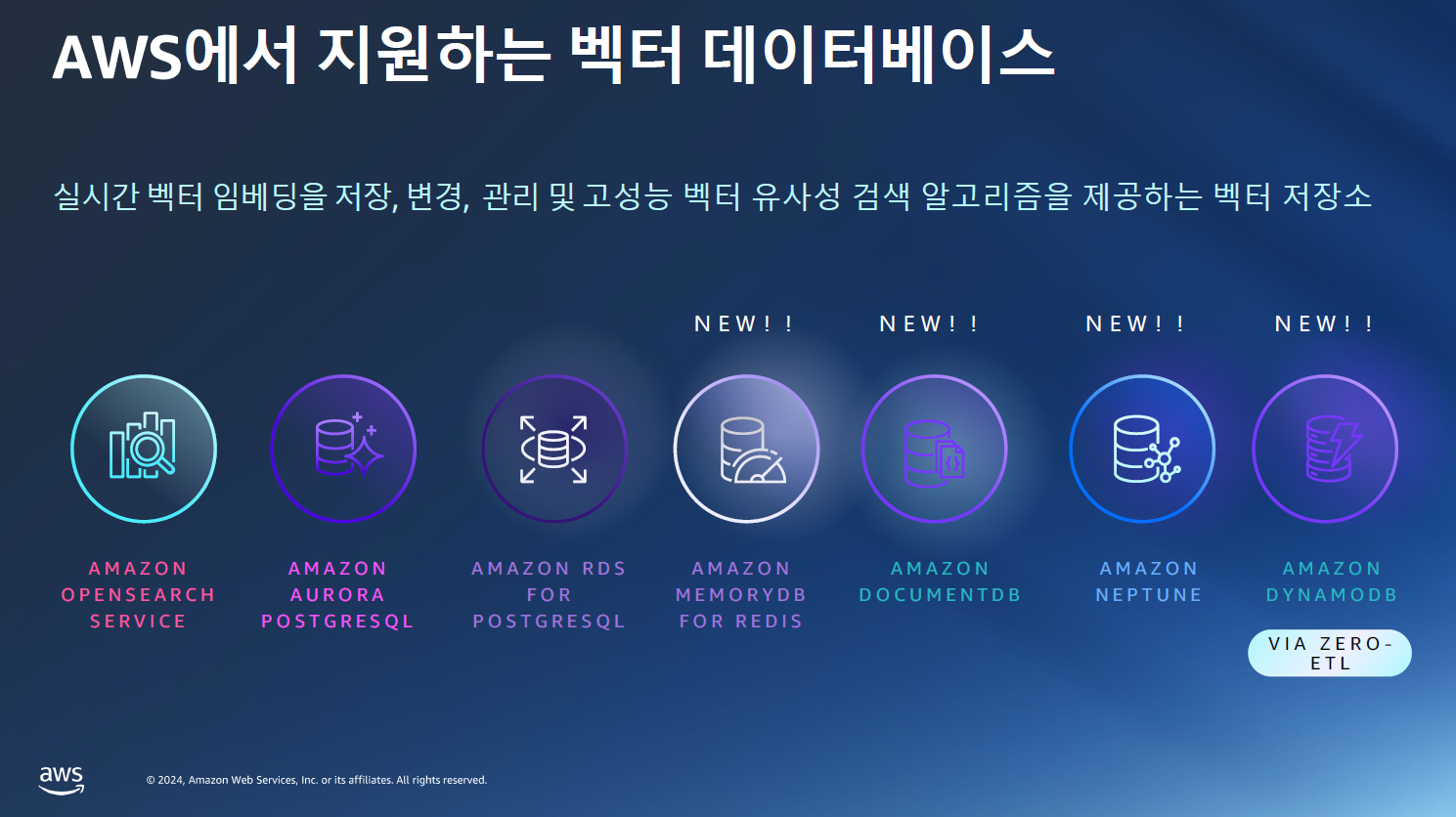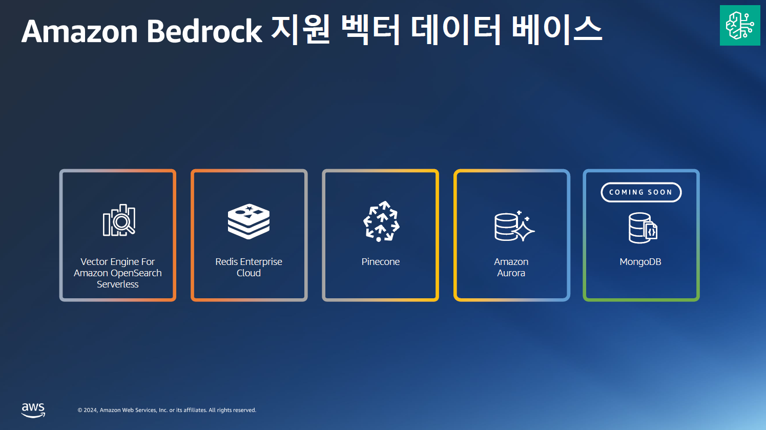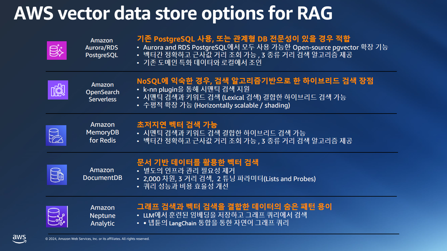 - Redis Enterprise Cloud, Pinecone, Amazon Aurora 활용 가능