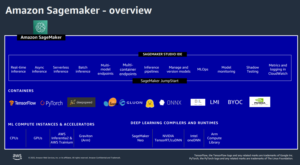 https://pages.awscloud.com/rs/112-TZM-766/images/ML%20Fridays%20-%20Deployment%20of%20LLM%20using%20Sagemaker%20-%2015%20September%202023.pdf - MLOps 지원: 기본 제공 알고리즘, 자동 모델 튜닝, 학습, 배포 등 ML 라이프사이클의 모든 단계 지원.