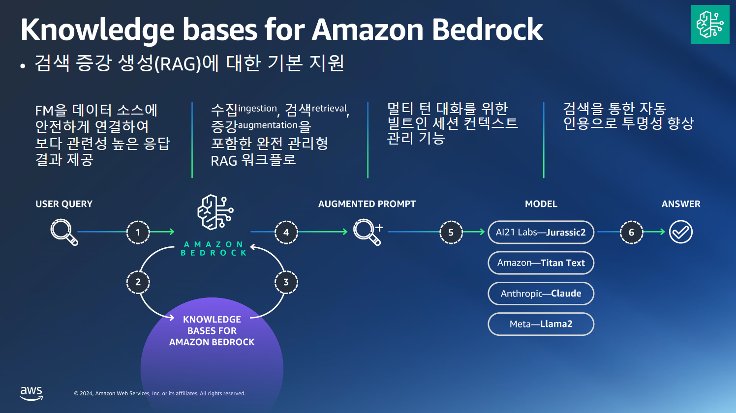 [AWS Bedrock] Agents로 Bedrock 기능 구체화하기 (0) 2024.03.03 [AWS Bedrock] RAG를 위한 지식베이스 생성 (1) 2024.02.27 [AWS Bedrock] Bedrock 시작하기 (0) 2024.02.27 [Python] AWS S3에 모델파일 저장하기, 불러오기 (boto3) (0) 2023.02.16 AWS S3 한번에 다운받기 (AWS CLI) (2) 2022.10.07