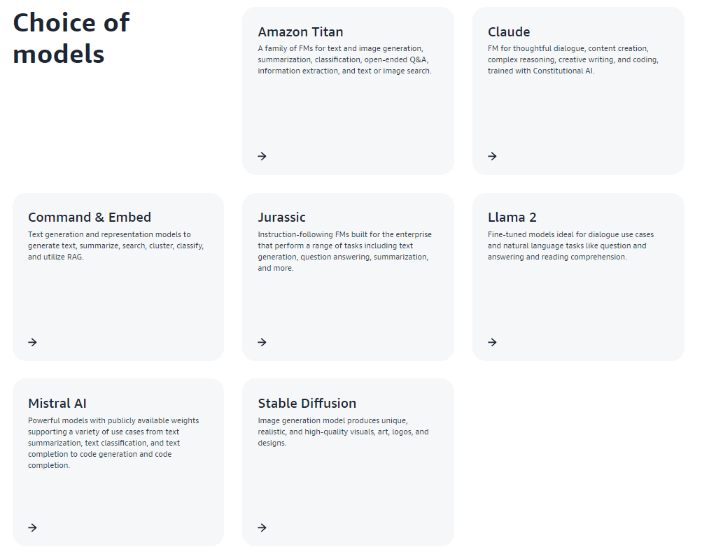 https://docs.aws.amazon.com/ko_kr/bedrock/latest/userguide/models-supported.html - 기초모델: 텍스트 요약, 다국어 텍스트 생성, 대화, 이미지 생성 등 사전 학습된 다양한 Foundation Model 제공