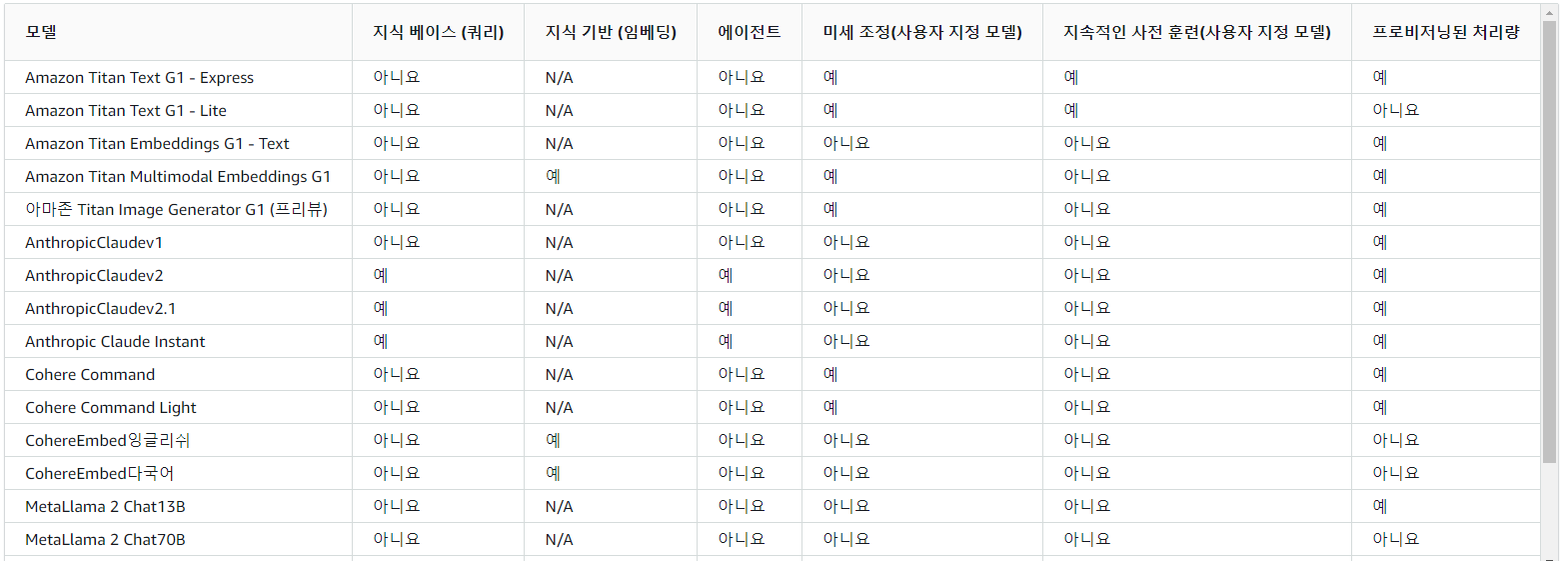 https://docs.aws.amazon.com/ko_kr/bedrock/latest/userguide/models-supported.html 이미지를 지원하는가, 임베딩을 지원하는가, fine-tuning을 지원하는가 등등이 모두 다릅니다.