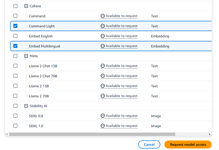 저는 자료 임베딩, RAG까지 테스트 해보고 싶어서 Cohere Command Light를 선택하겠습니다.