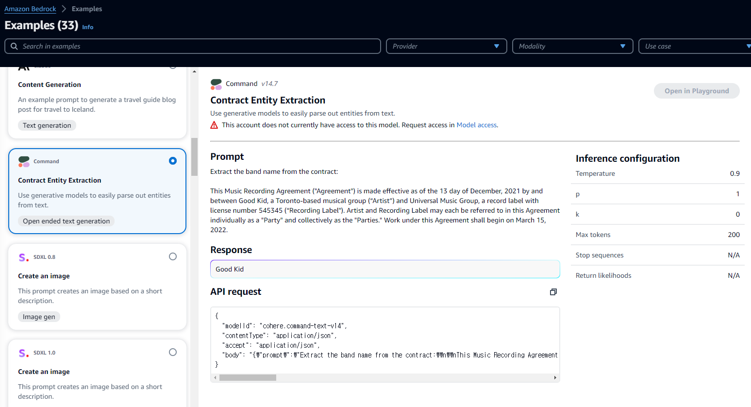 각 회사의 각 모델별로 API request에 필요한 정보와 형식을 알 수 있습니다. 저는 Cohere Command Light 모델을 기준으로 진행하겠습니다.