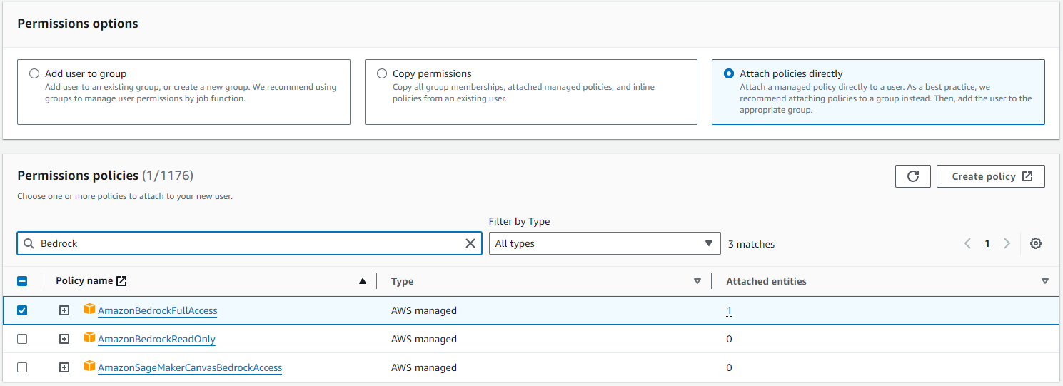 Step1에서 User의 이름 적당히 짓고난 뒤, Step2(사진)에서 Bedrock에 접근할 수 있는 policy를 잘 선택해주세요 추가) 사진에서는 BedrockFullAccess만 예시로 넣었는데, RAG를 위한 지식베이스 추가를 위해 설정하는 과정에서 필요한 Access들을 그때그때 추가로 넣었습니다.