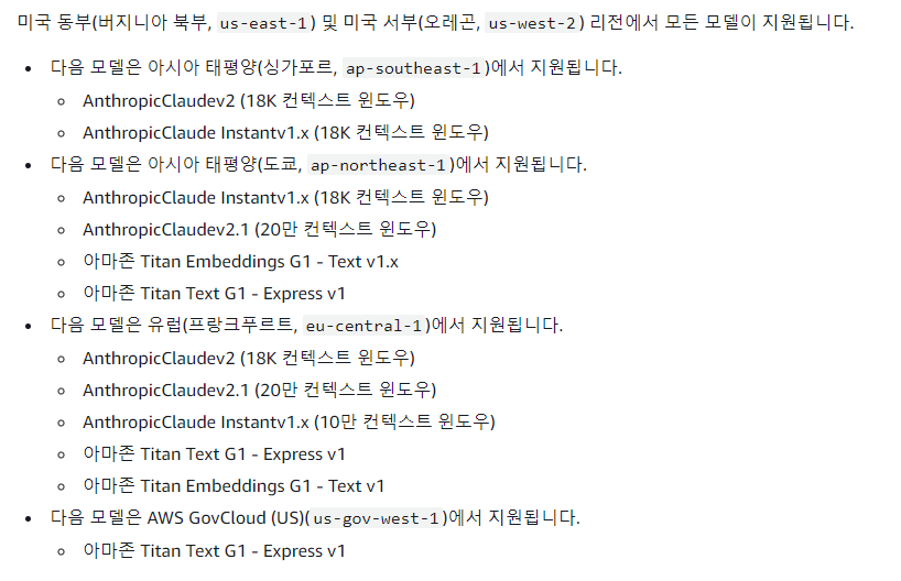 https://docs.aws.amazon.com/ko_kr/bedrock/latest/userguide/models-supported.html 미국 동부, 미국 서부를 제외하면 선택 가능 모델이 매우 제한됩니다.