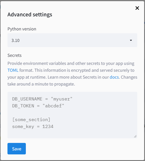 - 인증키, DB정보 등을 환경변수로 설정합니다. (TOML 포맷)