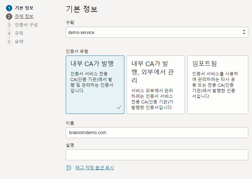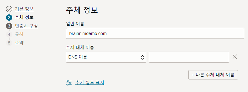 이름: OCI에서 Certificate구분하는 이름 (그냥 비교하기 쉽게 domainname.com 형태로 썼습니다.) 2) 주체 정보 Subject Information