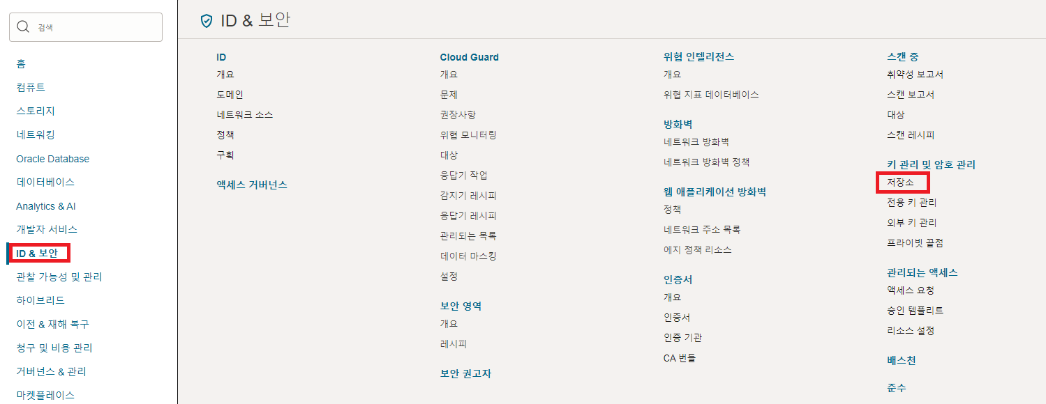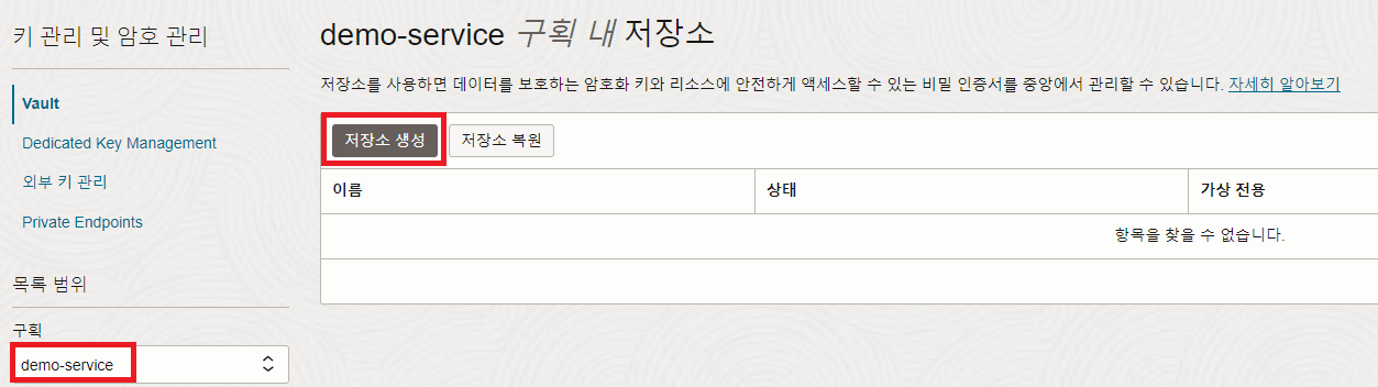 Allow dynamic-group '<YourDynamicGroupName>' to use keys in compartment <YourCompartmentName> Allow dynamic-group '<YourDynamicGroupName>' to manage objects in compartment <YourCompartmentName>2. valt(저장소) 생성