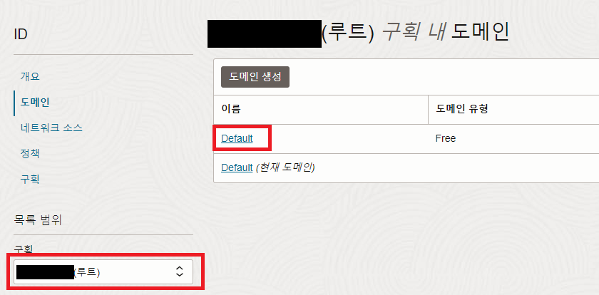 compartment(구획)에서 root를 선택한 뒤, Default 도메인으로 들어갑니다.