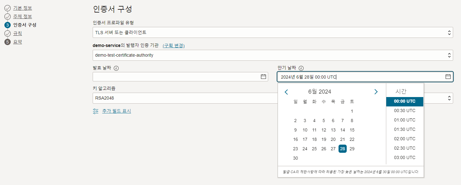 3. 인증서 구성으로 돌아가서 만기날짜를 몇 일 앞당겨 설정해줍니다.