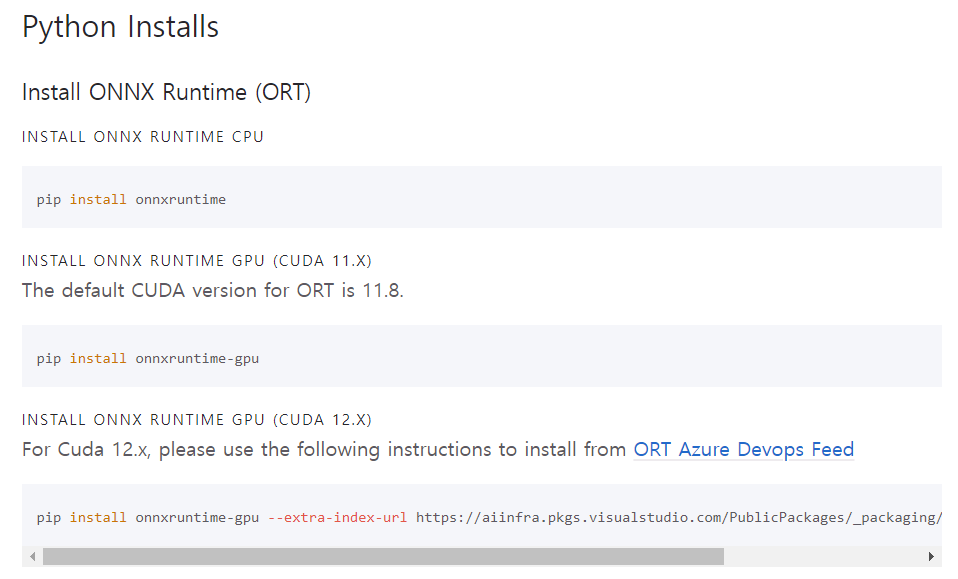 본인의 CUDA 버전을 잘 확인해주세요 (근데 문제가 발생해서 이 글까지 오신분들은 거진 12.X버전이셨겠죠?) # CUDA 12.X pip install onnxruntime-gpu --extra-index-url https://aiinfra.pkgs.visualstudio.com/PublicPackages/_packaging/onnxruntime-cuda-12/pypi/simple/정상 설치결과 확인