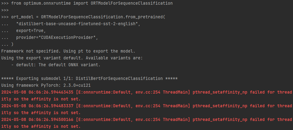 from optimum.onnxruntime import ORTModelForSequenceClassification ort_model = ORTModelForSequenceClassification.from_pretrained( "distilbert-base-uncased-finetuned-sst-2-english", export=True, provider="CUDAExecutionProvider", )