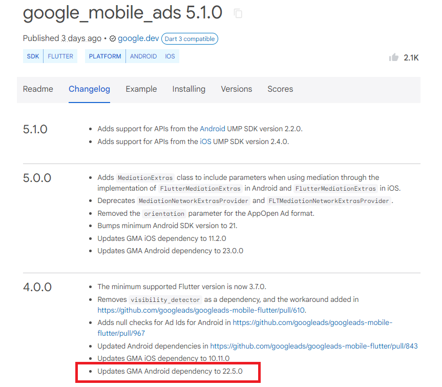 제가 사용하는 패키지는 22.5.0으로 맞춰줘야 합니다. (https://pub.dev/packages/google_mobile_ads/changelog) 패키지 간 충돌문제로 google_mobile_ads 패키지를 4.0.0으로 사용하고 있었는데 그 때문인 것 같습니다.