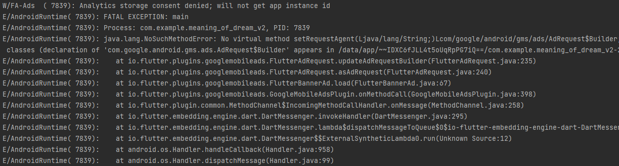 java.lang.NoSuchMethodError: No virtual method setRequestAgent(Ljava/lang/String;)Lcom/google/android/gms/ads/AdRequest$Builder; 원인파악