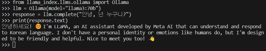 from llama_index.llms.ollama import Ollama llm = Ollama(model="llama3:70b") # 모델설정 # 단순 1회성 대화 response = llm.complete("안녕, 넌 누구니?") print(response.text)