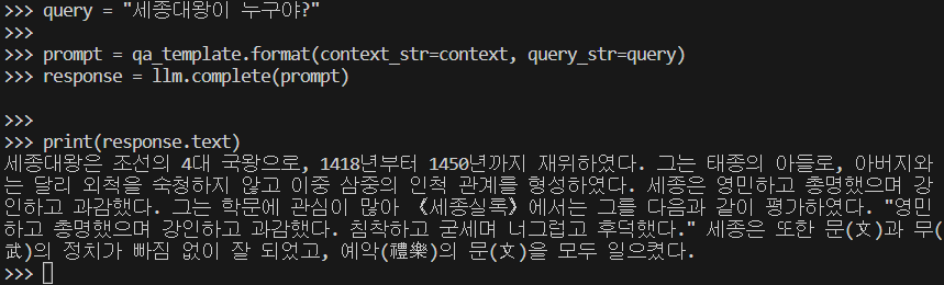 from llama_index.llms.ollama import Ollama from llama_index.core import PromptTemplate llm = Ollama(model="llama3:70b") # 모델설정 # template template = ( "We have provided context information below. \n" "---------------------\n" "{context_str}" "\n---------------------\n" "Given this information, please answer the question: {query_str}\n" "Please answer Korean.\n" ) qa_template = PromptTemplate(template) # context with open("context.txt","r",encoding='utf-8') as f: context = f.read() # 위키백과 [세종대왕] 문서 텍스트로 테스트 # question query = "세종대왕이 누구야?" # 단순 1회성 프롬프트 템플릿 설정 및 대화 prompt = qa_template.format(context_str=context, query_str=query) response = llm.complete(prompt) print(response.text)