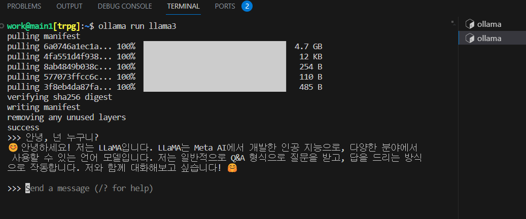 이렇게 돌아가고 있다면 잘 작동하고 있는 것 입니다. # 정상 작동여부 확인 (새 터미널에서) ollama run llama3