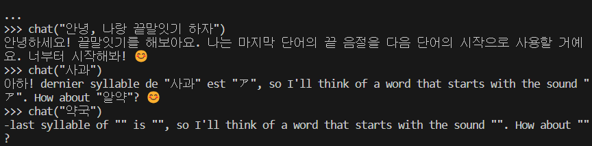 예의도 없고 끝말잇기도 못하지만 암튼 대화에 연속성이 생겼습니다. 반응형'Data & ML & AI > LLM' 카테고리의 다른 글