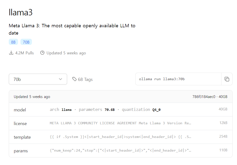 - 8B외, 타 모델을 돌리고 싶다면 ollama run llama3:70b와 같이 입력하면 됩니다.
