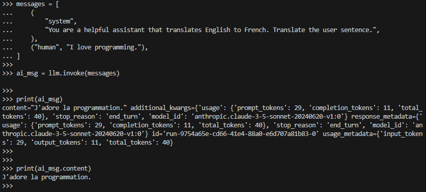 messages = [ ( "system", "You are a helpful assistant that translates English to French. Translate the user sentence.", ), ("human", "I love programming."), ] ai_msg = llm.invoke(messages) print(ai_msg) print(ai_msg.content)