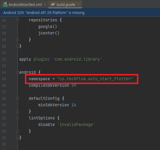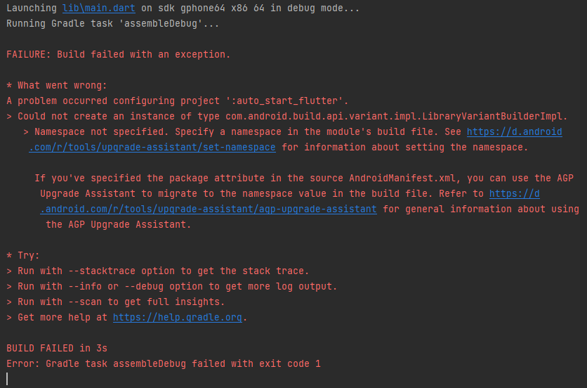 auto_start_flutter의 Namespace를 못찾는다고 합니다. 더보기FAILURE: Build failed with an exception.