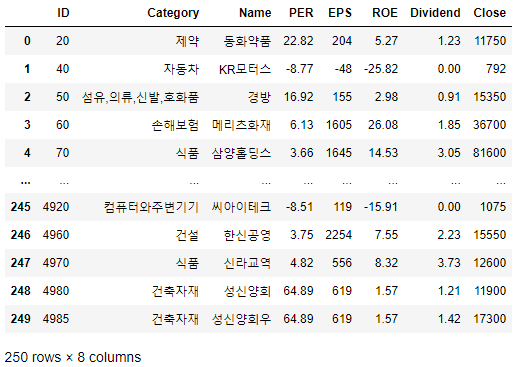 # pandas import pandas as pd # data df = pd.read_csv('stock_market.csv') sample_df = df[['ID', 'Category', 'Name', 'PER', 'EPS', 'ROE', 'Dividend', 'Close']] sample_df.head(5)