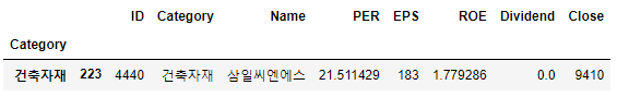 250개 종목 중 유일하게 PER과 ROE가 비어있는 삼일씨엔에스(004440)의 결측치를 처리해보겠습니다.