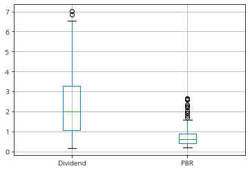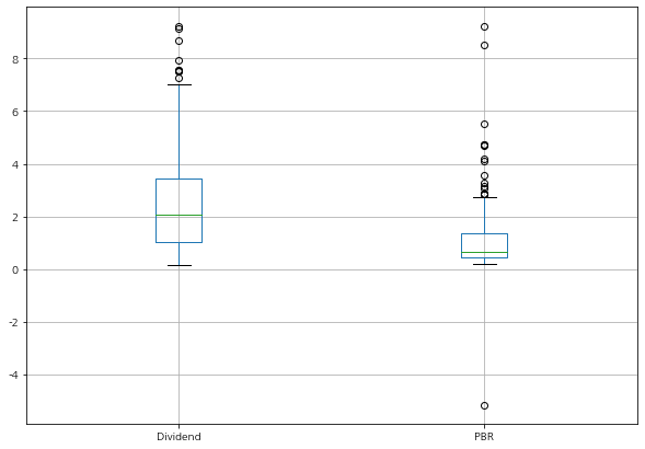 # matplotlib import matplotlib as mpl import matplotlib.pyplot as plt import matplotlib.font_manager as fm plt.rcParams['axes.unicode_minus'] = False # matplotlib 마이너스기호 표시 plt.rc('font', family='NanumGothic') # matplotlib 한글폰트 표시 # pandas import pandas as pd # data df = pd.read_csv('stock_market.csv') df.boxplot(column=['Dividend','PBR'])