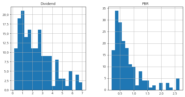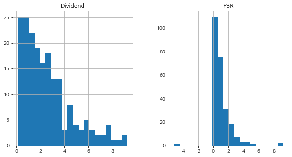 original_df = df[['Dividend','PBR']] original_df.hist(bins=20, figsize=(10,5))