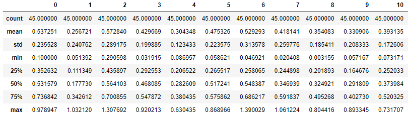 모든 칼럼에서 (max=1, min=0)이 되었습니다.X_scaled_test = scaler.transform(X_test) pd.DataFrame(X_scaled_test).describe()