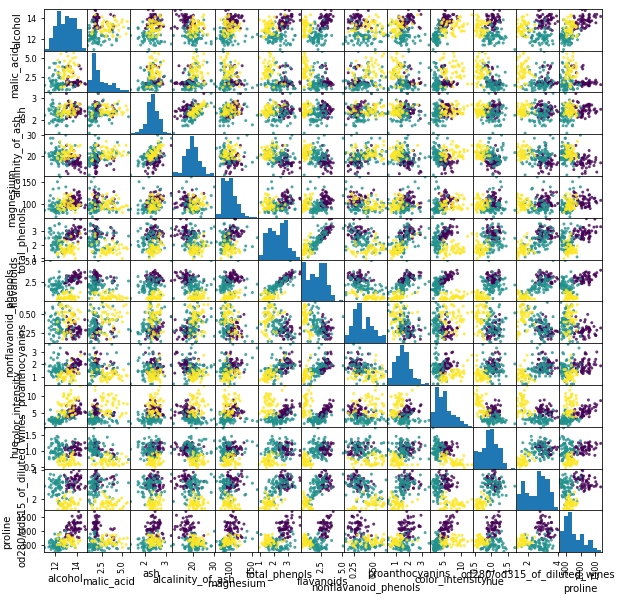 pd.plotting.scatter_matrix(df, c=Y, figsize=(10, 10),alpha=.8)