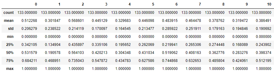 모든 칼럼에서 (max=1, min=0)이 되었습니다.X_scaled_test = scaler.transform(X_test) pd.DataFrame(X_scaled_test).describe()