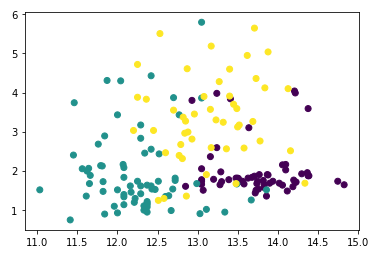 import matplotlib.pyplot as plt fig, ax = plt.subplots() ax.scatter(df['alcohol'], df['malic_acid'], c=Y)