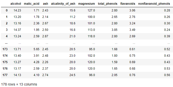 import pandas as pd from sklearn.datasets import load_wine wine = load_wine() # X X = wine['data'] feature_names = wine['feature_names'] # Y Y = wine['target'] df = pd.DataFrame(X, columns = feature_names) df