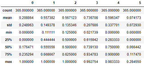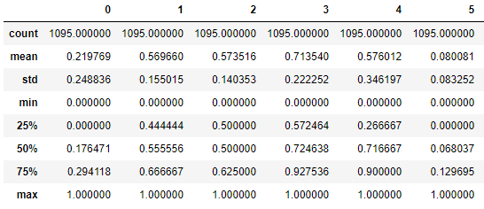 from sklearn.preprocessing import MinMaxScaler scaler = MinMaxScaler() scaler.fit(X_train) X_scaled_train = scaler.transform(X_train) pd.DataFrame(X_scaled_train).describe()