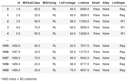 import pandas as pd from sklearn.datasets import fetch_openml housing = fetch_openml(name="house_prices", as_frame=True) # X X = housing['data'] feature_names = housing['feature_names'] # Y Y = housing['target'] df = pd.DataFrame(X, columns = feature_names) df